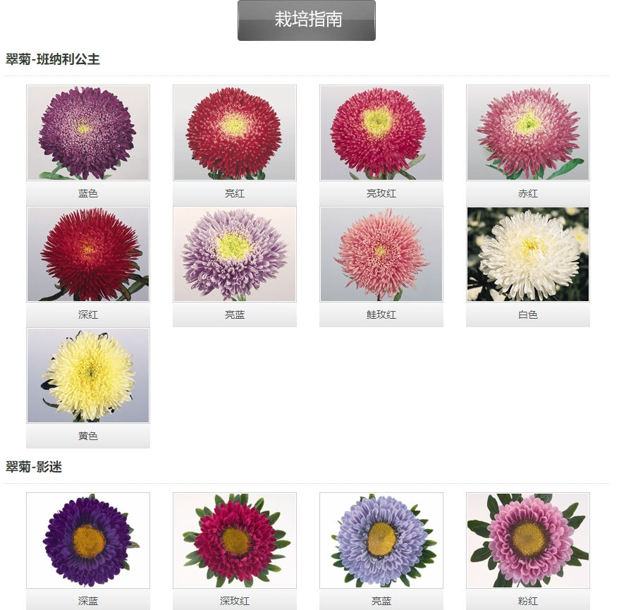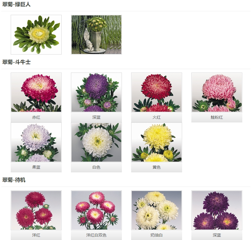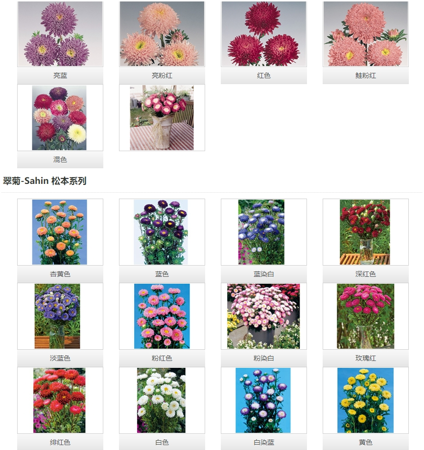 株高約60厘米,花徑5-6厘米,花芯亮黃色,花直立。品質極好,抗鐮刀霉菌,收益性好,是最重要的切花商品翠菊。