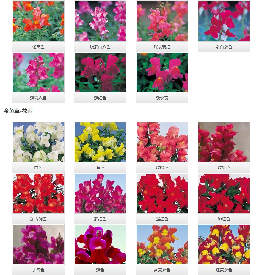 古銅色;深玫瑰紅;淺紫白雙色;橘黃色;橘白雙色;紫紅色;紫粉雙色;紫玫瑰;紫白雙色;紅色;紅白雙色;粉黃雙色;白色;黃色;混合;