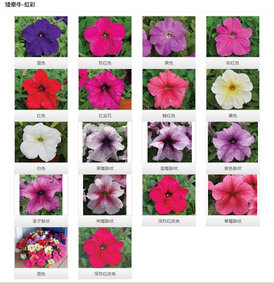 藍色;白花藍色脈紋;藍色脈紋(淺藍色帶深藍色脈紋);酒紅;酒紅白邊;白星酒紅;洋紅 ;淺鮭粉拂曉 ;淡紫;淡紫拂曉;霓紅;桃紅脈紋;粉紅;粉紅拂曉;李子色脈紋 ;玫紅脈紋;紅色;紅色拂曉;玫紅;玫紅白邊;白星玫紅;鮭紅;猩紅;天藍色 ;白色 ;黃色;沙漠混色;脈紋混色;拂曉混色 ;尼加拉混色;淺暈混色;常規混色;水粉混色;