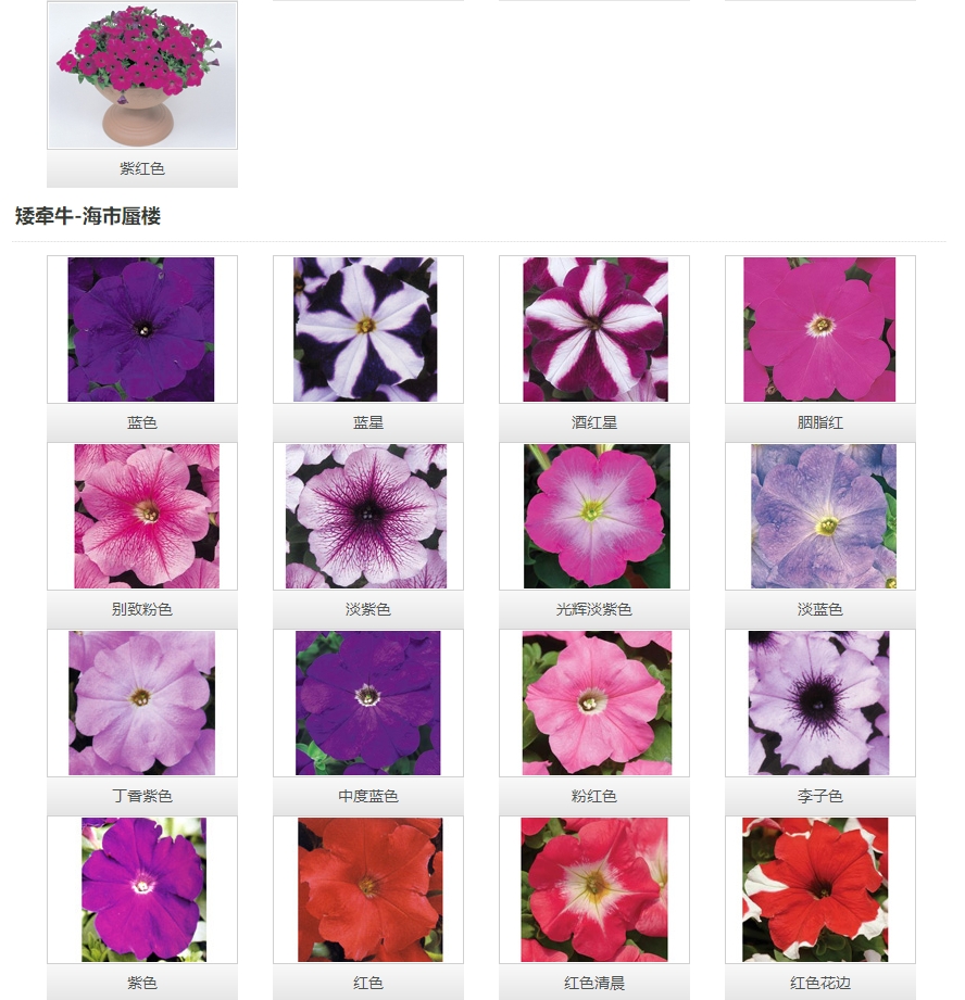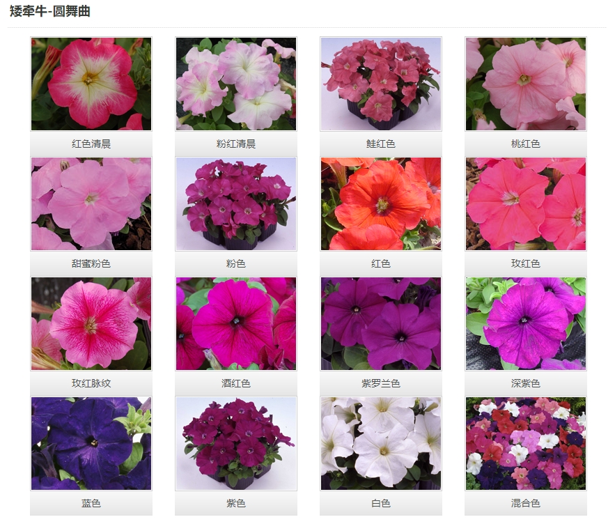 中大花-單瓣型,多花型 。株高25-30厘米,多花,整個系列花期一致,花量大,極度耐雨水,廣泛的顏色選擇,適合各種不同的設計搭配,是私人庭院及花壇花的最佳選擇品種,多花矮牽牛中的暢銷品種。