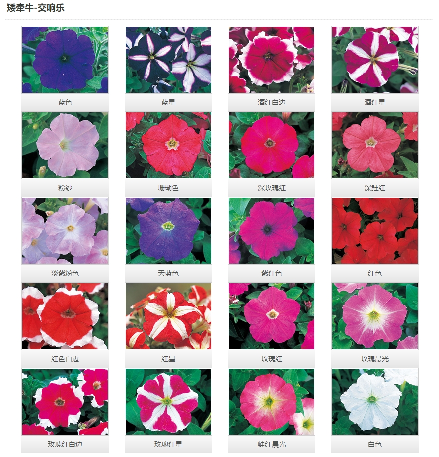 白色;鮭肉色 ;粉色;玫紅色;紫紅色;櫻桃玫紅色;紅色;玫紅色;白邊;紅色白邊;酒紅色白邊;藍色白邊;藍色改良;粉色晨光;玫紅晨光;紅色晨光;藍色晨光;粉色葉脈;紫紅色葉脈;混合晨光;混合色;帶邊混合色 ;