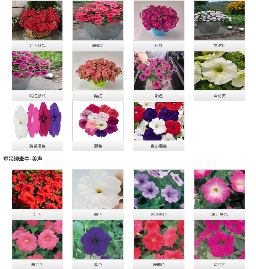大花、多花型,株高25-35厘米,花開不斷。市場上最早花的垂吊矮牽牛系列,比競爭者早開花7天。花期一致,6天之內整個系列都會開花。